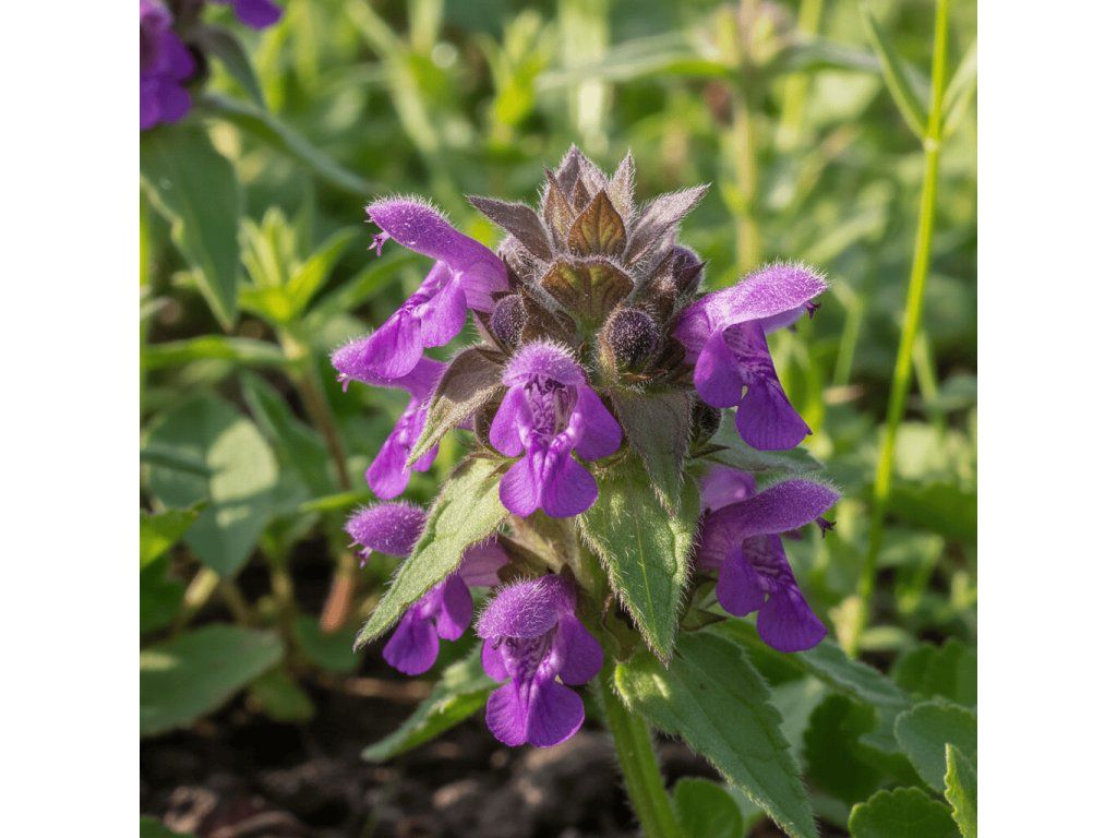 Na vrcholcích krátkých lodyh se objevují výrazná květenství složená z větších, sytě fialových až purpurových květů. Mají typický tvar dvoupyských květů a působí jako malé, pevné koruny, které se drží blízko země, a přesto jsou nepřehlédnutelné.