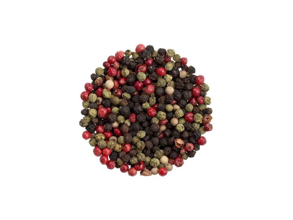 Složení: pepř černý celý*, pepř bílý celý*, pepř zelený celý*, pepř červený (růžový) celý*
